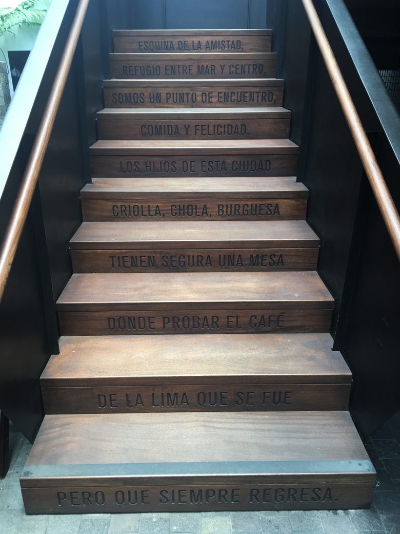 Instalado em um casarão branco e imponente em meio a agitada Miraflores, sem placas, o Café de Lima chama a atenção para quem olha de fora, mas conquista quem entra. Com um design arrojado e, para mim, até inovador considerando os outros cafés da cidade, o Café de Lima é bem lindo com seus painéis de arte, escada com poesia e um agradável pátio onde as horas passam rápido demais. É em Lima, mas poderia ser em qualquer lugar do mundo.