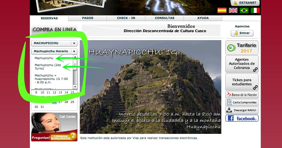 Os ingressos para Machu Picchu que podem ser comprados, através do site oficial do Ministério de Cultura, são: